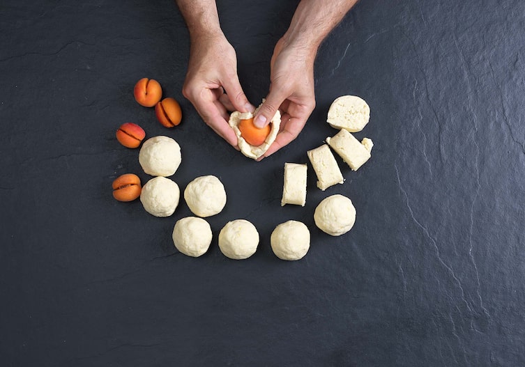3. Den Teig zu kleinen Kugeln formen und jeweils eine Marille in die Mitte geben. Die Knödel gut verschließen, sodass die Füllung nicht herausfallen kann.